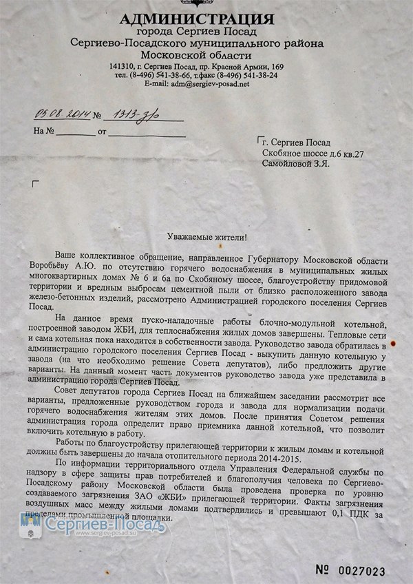 Новая котельная была введена в эксплуатацию на Скобяном шоссе, возле завода ЖБИ. Событие было даже анонсированно на сайте губернатора Московской области, где сказано, что теперь все дома в районе будут обеспечены горячей водой. На самом деле дома оказалось всего два: №6 и №6а, да и котельная не такая уж новая. Со слов жителей , построена она была года три тому назад, и до сей поры стояла без действия, никак не получалось ввести ее в эксплуатацию, по административно-разрешительным причинам. Все это время бывшие ведомственные дома обеспечивал теплом и горячей водой завод ЖБИ.
